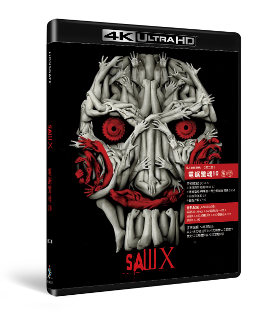 (第二版)Saw X" 【独有原版及全中文导航双模菜单】独享狮门美版、Metropolitan法版、运河影业德版、鹰影业意版共四版4K UHD复合版本,荟萃中法泰悉数官方素材精华,优选美版框架,盛佳独家杜比视界及HDR10双格式视频,特别十死无生杜比全景声7.1.4沉浸式高清无损原音,官方中(港台双版)英法西泰字幕,盛佳全市场独家汉化评论字幕,保留原版完整幕后花絮内容并附独家全程中文字幕 英DD-Atmos 7.1.4 英DTS-HD5.1 法5.1-640 西5.1-640 泰语2.0-192 英评2.0-192 英 法 西 中简 中繁 中繁 泰 中简评 中繁评 "※多段制作特辑 01:35:47※绘画灵感:与导演一同分解插画场景 33:55※化妆测试 17:28※删剪片段 37:10" "杜比视界HDR10""《电锯惊魂》系列正宗续集,开创者温子仁担任回归制片人,拼图杀人魔开启十死无生全新篇章,豆瓣评分高达7.6洗版:加多版4K,集齐中法泰官方素材,盛佳独家汉化评论" "导演: 凯文·格劳特编剧: 乔什·斯托博格 / 皮特·古德芬格主演: 托宾·贝尔 / 肖妮·史密斯 / 西诺薇·玛考迪·伦德 / 史蒂文·布兰德 / 蕾内塔·瓦卡"